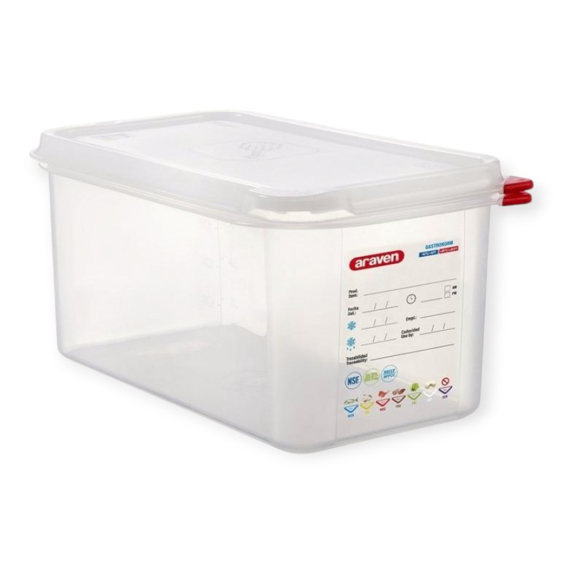GN 1/3 h.150mm 6 lt. αεροστεγή δοχεία σχεδιασμένα για επαγγελματίες της εστίασης. Το αεροστεγές δοχείο διατίθεται σε μεγέθη Gastronorm. Το αεροστεγές δοχείο τροφίμων έχει μόνιμη ετικέτα σύμφωνα με τον κανονισμό ιχνηλασιμότητας Reg (CE) n.852/2004 Reg(CE) n.178/2002. Γράψτε στην ετικέτα ετικέτα με το μη τοξικό μαρκαδόρο της ARAVEN και η ετικέτα θα παραμείνει σαν καινούργια ακόμα και μετά το πλύσιμο. Τα αεροστεγή δοχεία, με τη νέα σχεδίαση του καπακιού τους, διατηρούν τα τρόφιμα καλύτερα και για μεγαλύτερο χρονικό διάστημα: ΝΕΑ ΒΕΛΤΙΩΜΕΝΗ ΣΤΕΓΑΝΩΤΗΤΑ. Ο νέος σχεδιασμός του διπλού αεροστεγούς χείλους στο καπάκι βελτιώνει την αεροστεγανότητα του δοχείου ώστε να συντηρεί καλύτερα τα τρόφιμα. ΑΥΞΑΝΕΙ ΤΗ ΧΡΗΣΙΜΗ ΖΩΗ ΤΩΝ ΤΡΟΦΙΜΩΝ . Το καπάκι διαθέτει ένα κανάλι που επιτρέπει την αποβολή μέρους του αέρα μέσα στο δοχείο, μειώνοντας την οξείδωση των τροφίμων και παρατείνοντας την ωφέλιμη ζωή τους έως και 25%* (*Μελέτη που διεξήχθη από την Ερευνητική Ομάδα Τροφίμων Φυτικής Προέλευσης του Πανεπιστημίου της Σαραγόσα ). ΕΥΚΟΛΟ ΑΝΟΙΓΜΑ. Το καπάκι έχει μια ειδική γλωττίδα για να διευκολύνει το άνοιγμα του δοχείου. Τα νέα αεροστεγή δοχεία GastroNorm της Araven περιλαμβάνουν επίσης νέους χρωματικούς συνδετήρες που βοηθούν στη διαχείριση των τροφίμων και διαθέτουν βελτιώσεις στην ετικέτα ιχνηλασιμότητας IML.