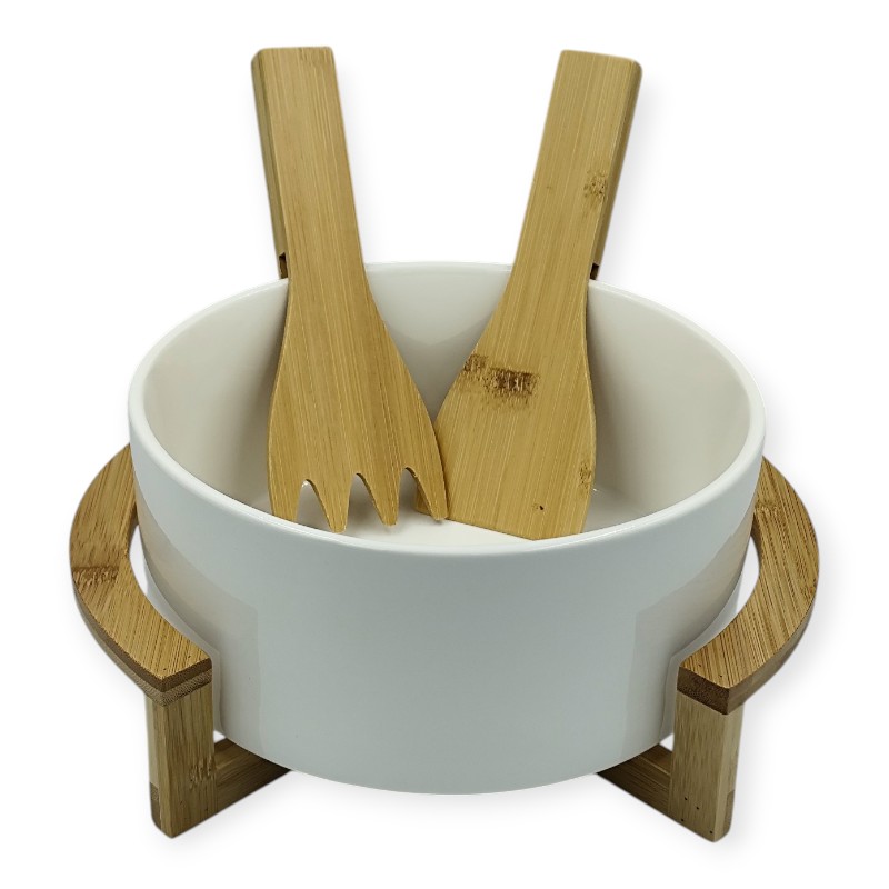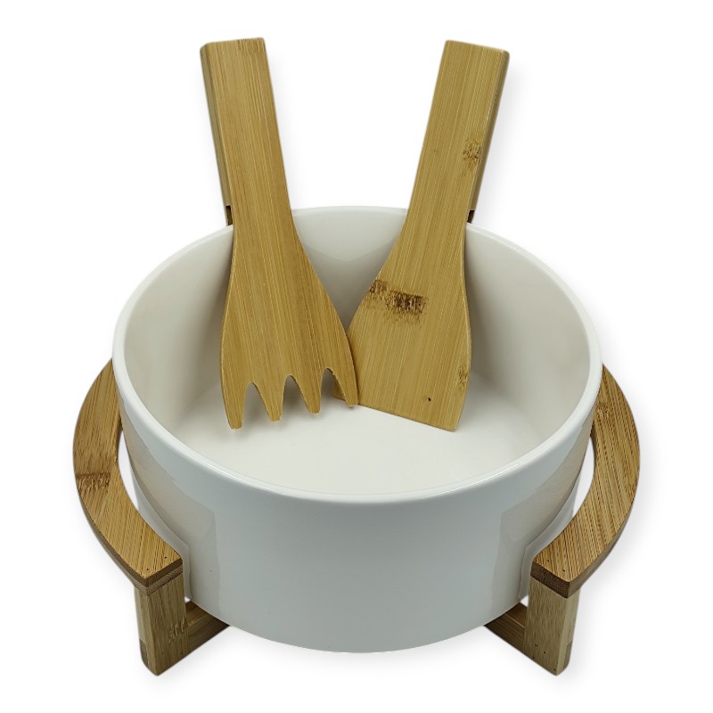 HFA Σαλατιέρα Πορσελάνινη Με Βάση Και Ξύλινες Κουτάλες Λευκή PARTY TIME 22cm