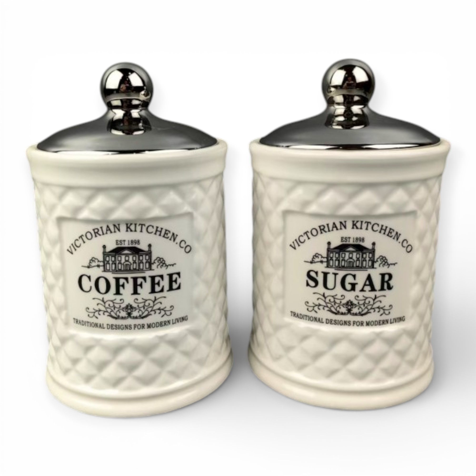 Karvounis Σετ 2 Τεμαχίων Κεραμικά Βάζα Καφέ Και Ζάχαρη Λευκό Με Ασημί Καπάκι VICTORIAN KITCHEN 16cm HC1904063-6.25