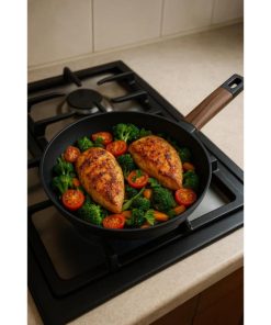 Χυτό αλουμίνιο. Εργονομική, θερμομονωτική λαβή από βακελίτη. Διπλή αντικολλητική επίστρωση Καρβιδίου του Πυριτίου. Η κεραμική σκόνη καρβιδίου του πυριτίου, (CARBORUNDUM (silicon carbide)) σε μορφή σκληρών μικροσφαιρών, όχι μόνο δρα στην επίστρωση αυξάνοντας τη σκληρότητά της, αλλά έχει επίσης ιδιαίτερα καλή αντοχή στη φθορά και αντοχή στο τρίψιμο. Δεν θα επηρεάσει την ποιότητα χρήσης σε οποιαδήποτε θερμοκρασία, έχει εξαιρετική αντοχή στη διάβρωση και χημική αντοχή και έχει μεγάλη διάρκεια ζωής. Η μορφή του καρβιδίου του πυριτίου ως σκληρές μικροσφαίρες, είναι αυτή που δημιουργεί την σαγρέ υφή της αντικολλητικής επιφάνειας. Η αντικολλητική επίστρωση με καρβίδιο του πυριτίου δεν περιέχει PTFE, PFOA, Μόλυβδο και Κάδμιο. Επαγωγική βάση πάχους 3.6mm. Οδηγίες ορθής χρήσης: Πλύντε καλά το σκεύος με χλιαρό νερό και απορρυπαντικό πιάτων πριν την πρώτη χρήση. Καθαρίστε το σκεύος μετά τη χρήση με μαλακό σφουγγάρι και ήπιο απορρυπαντικό πιάτων. Μην τοποθετείτε το σκεύος άδειο σε εν λειτουργία επιφάνεια μαγειρέματος. Για την αποφυγή σκεβρώματος, μην εκθέτεται το σκεύος σε απότομες αλλαγές θερμοκρασίας, όπως ρίχνοντας νερό στο ζεστό σκεύος, ή τοποθετώντας το επάνω σε παγωμένες επιφάνειες. Αποφύγετε το τρίψιμο με σύρμα κουζίνας ή με μεταλλικά αντικείμενα. Συνιστάτε η χρήση ξύλινων ή πλαστικών εργαλείων κατά τη χρήση των σκευών. Κατάλληλο για πλυντήριο πιάτων. Κατάλληλο για όλες τις επιφάνειες μαγειρέματος, και για επαγωγικές. Πάχος σώματος 4.5 χιλιοστά. Πάχος βάσης 3.6 χιλιοστά.
